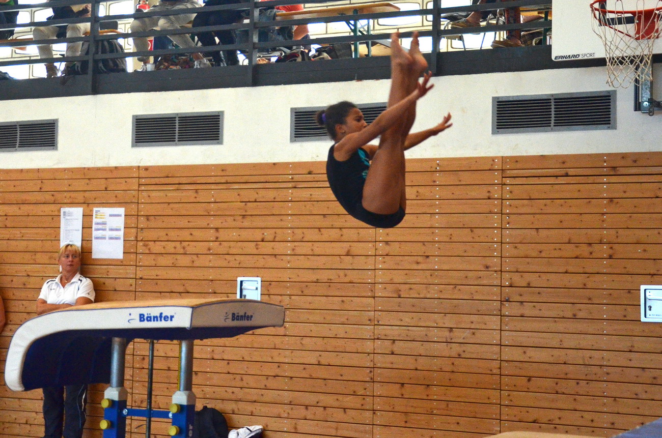 Im dritten Durchgang hieß es dann für die beiden anderen Mannschaften “Ran an die Geräte!”. Wie schon fast Tradition ist, begannen die Mädels ihren Wettkampf allesamt am Balken. Die jüngere Mannschaft, bestehend aus Natalie Kann (2003), Tanin Azarnousha (2003), Maria Rundau (2004), Angelina Kann (2005) und Sarah Adolphs (2006) machte ihre Sache sehr gut. Alle vier Starterinnen an diesem Gerät machten ihre Sache sehr gut und keine musste das Gerät unfreiwillig verlassen. Besonders Natalie und Angelina strahlten eine große Sicherheit aus und wurden mit jeweils 16,25 und 16,45 Punkten belohnt. Bei der anderen Mannschaft, vertreten durch Pauline Friedrich (2000), Anna Kulbach (2001), Jessica Haelke (2001), Sarah Shirvani Zadeh (2001), Anja Woizenko (2002) und Cecile Weissenburger (2002), sonst ebenfalls so sicher am Balken, steckte an diesem Tag der Wurm drin. Cecile, die in der Woche zuvor auf Klassenfahrt gewesen war, blieb zwar oben, brachte ihre Übung aber gehörig durcheinander. Die anderen Mädels, vielleicht durch den missglückten Einstieg verunsichert, mussten das Gerät zum Teil mehrfach verlassen oder große Abzüge für Wackler hinnehmen. Insofern war die Stimmung hier etwas gedrückt. Nichtsdestotrotz wollte mit Sicherheit niemand aufgeben. Der Boden verlief für beide Mannschaften durchaus erfreulich, besonders da Angelina, Sarah A. und Anja ihre Übung erst in der Woche zuvor erlernt hatten und auch die anderen P-8er noch relativ frisch waren. Hier heimsten Natalie und Sarah A. beide 16er Wertungen ein und Pauline konnte sich über eine 17,10 freuen. Am Sprung muss man immer auf alles gefasst sein, aber trotz einiger Kopfstände beim Einturnen kamen alle acht Turnerinnen problemlos über den Tisch. Die Höchstwertung erturnte sich bei den Jüngeren diesmal Tanin, die mit tollen 16,65 bewertet wurde, aber auch die drei andern mussten sich mit ihren 16er Wertungen nicht verstecken. Auch die Großen zeigten zwei Überschläge und zwei Yamashitas, von denen der von Cecile mit 17,60 Pkt. am besten bewertet wurde. Dann hieß es nur noch über den Barren zu kommen. Hier war im Vorfeld ganz und gar nicht klar, wer überhaupt ans Gerät gehen sollte, dementsprechend drängten sich zu Beginn elf Mädels um den Barren bis letztendlich jeweils vier Starterinnen benannt wurden. Ähnlich wie am Balken, zeigte die jüngere Mannschaft hier, dass sie über sich selbst hinauswachsen kann. Sarah A. zeigte eine saubere P6, Angelina erstmalig eine (überraschend sichere) P7 und Maria wie auch Natalie bereits routinierte 7er-Übungen, die allesamt mit über 16 Punkten, in Natalies Fall sogar tollen 16,8, belohnt wurden. Bei den Größeren wollte es wiederum nicht ganz rund laufen. Sarah Z., die erste Starterin, konnte sich nicht am Barren halten und musste ihre Übung nach den ersten zwei Teilen abbrechen. Die anderen drei Mädels konnten sich diesmal aber, trotz einer Schrecksekunde bei Paulines Übung, konzentrieren und ihre eigenen Übungen sicher, wenn auch etwas vorsichtig, durchturnen, und auch die Noten konnten sich sehen lassen.