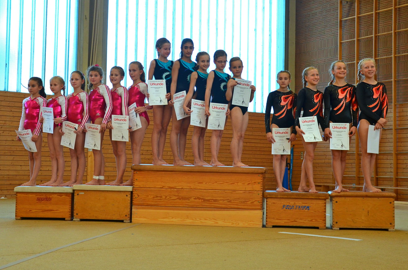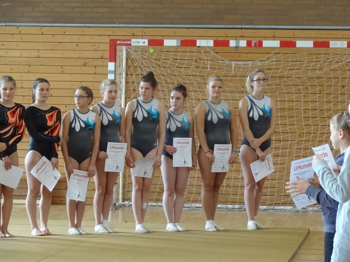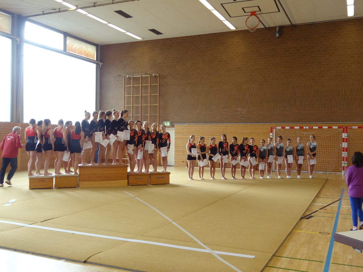 Bei der Siegerehrung wurde es dann richtig spannend. Die Kleinen hatten zwar allesamt einen super Wettkampf geturnt, aber auch die Konkurrenz war stark. Bei den Großen hatte es im Vorfeld etwas entspannter ausgesehen, aber jetzt war nicht klar, ob es denn für den zweiten Platz reichen würde. Als dann die ältere Porzer Mannschaft tatsächlich auf dem zweiten Rang aufgerufen wurde, konnte man den Mädels neben der Freude auch eine gewisse Erleichterung ansehen. In den Gesichtern der jüngeren Mädels indessen konnte man allseits ein breites Lachen sehen, hatten die Kleinen es doch geschafft sich gegen die Konkurrenz durchzusetzen und den Wettkampf für sich zu entscheiden.