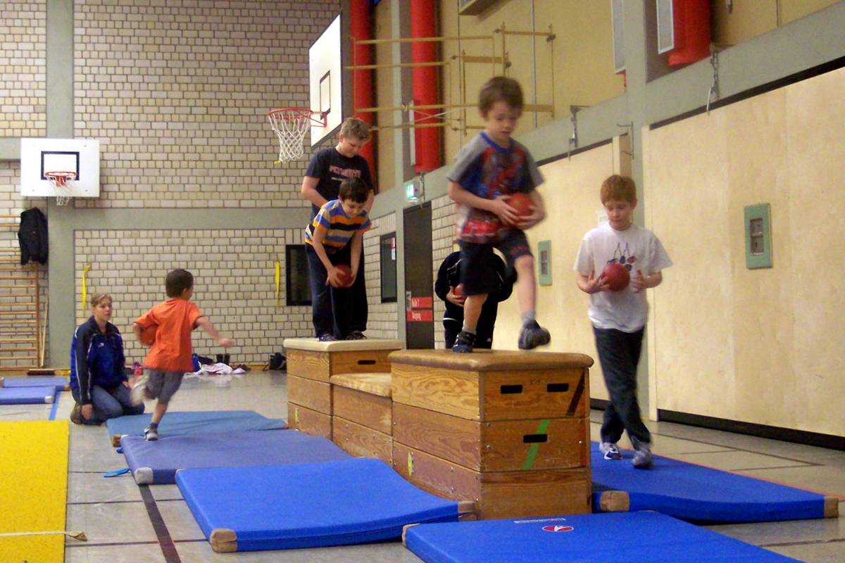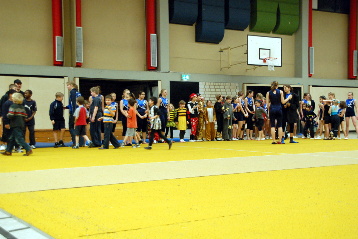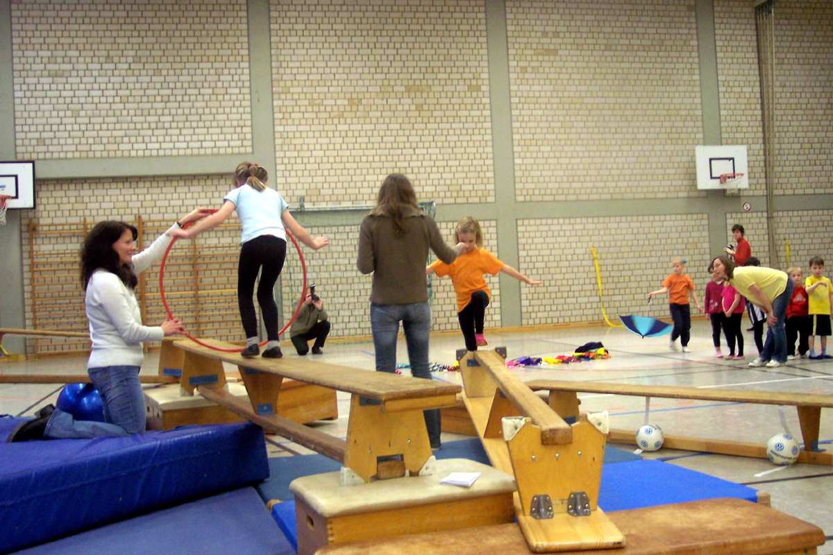 Auf einem Geräte-Parcours haben Mädchen und Jungen aus der Kleinkinderturngruppe (Übungsleiterin: Gerda-Marie Lothmann-Herm) ihr Programm vorgeführt. Der Schwerpunkt des Programms war Balancieren. Die Kinder mussten sich auf unterschiedlich gestellten Turnbänken fortbewegen. Sie gingen vorwärts, rückwärts oder seitwärts, nach oben oder nach unten, auf der breiten oder auf der schmalen Seite der Bank, manchmal hielten sie dabei einen kleinen Regenschirm in der Hand.