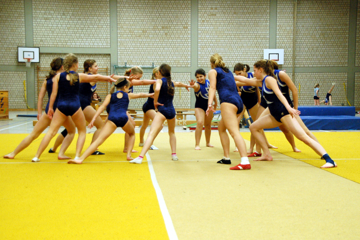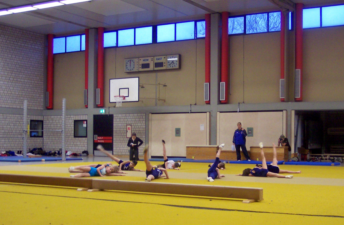 Die Mädchen aus der Gruppe M4 (Übungsleiterin: Andrea Schmidt) haben in ihrem Programm - "Lustige Pänz am Boden und Balken" - Bodenturnen mit Balkenübungen zusammengesetzt.