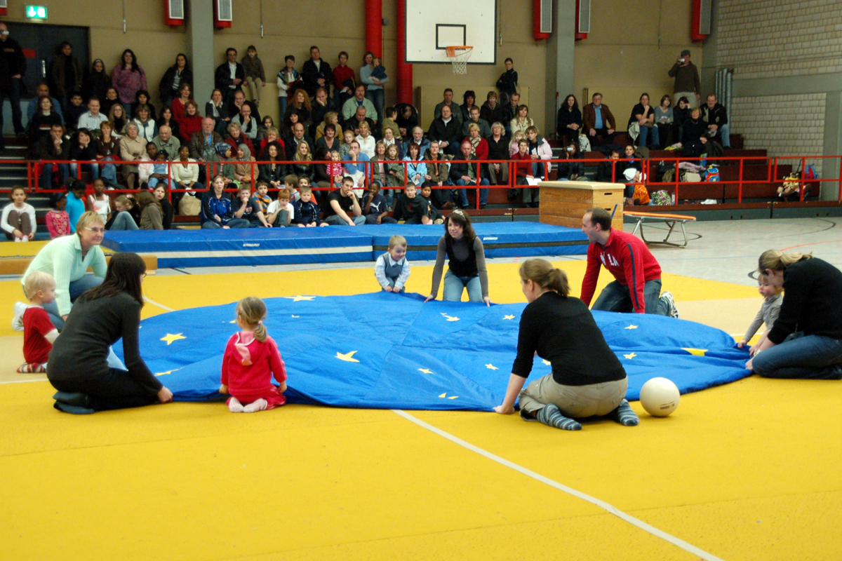 Jede Turngruppe stellte sich in einem kurzen Programm vor und zeigte etwas Interessantes. Als erstes gingen die ganz kleinen Mitglieder unseres Vereins - Kinder im Alter von 2 bis 4 Jahren in Begleitung der Mütter oder Väter (Übungsleiterin: Daniela Terbrack) auf die Bodenfläche. "Spiel mit dem Fallschirm" hieß ihr Programm. Sie spielten mit einem großen, bunten Tuch - mal kletterten sie oben drüber, mal krochen die Kinder unter das Tuch und spielten Verstecken. Die Kleinen waren mit sichtlichem Spaß bei der Sache.