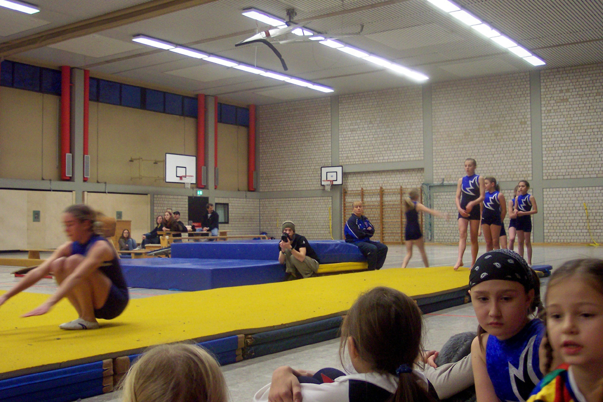 Die Jungen-Gruppe (Übungsleiter: Kai Herm) hat den Zuschauern viele Sprünge in ihrem Programm "Luftakrobatik mit dem Trampolin" gezeigt. Die Jungs sprangen über den Kasten oder auch durch den hoch gehaltenen Reifen und landeten in verschiedenen Positionen.