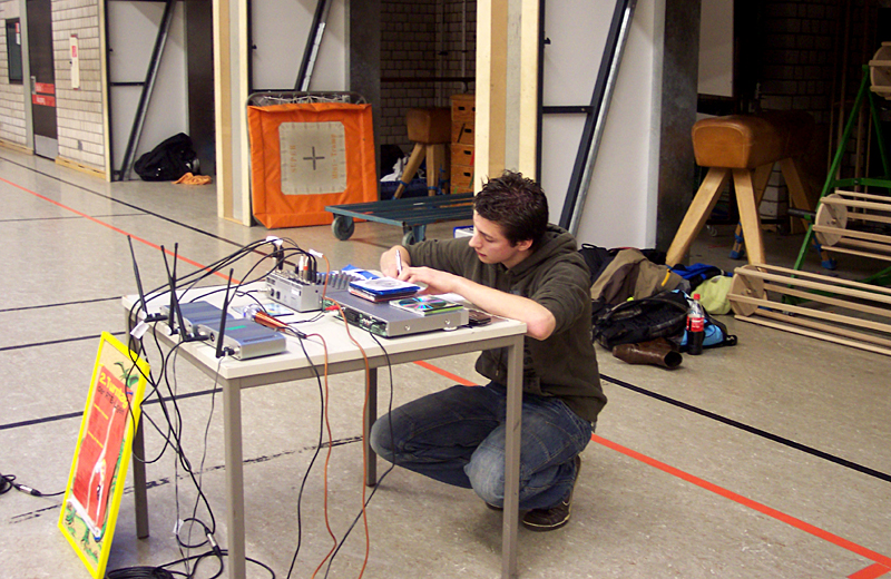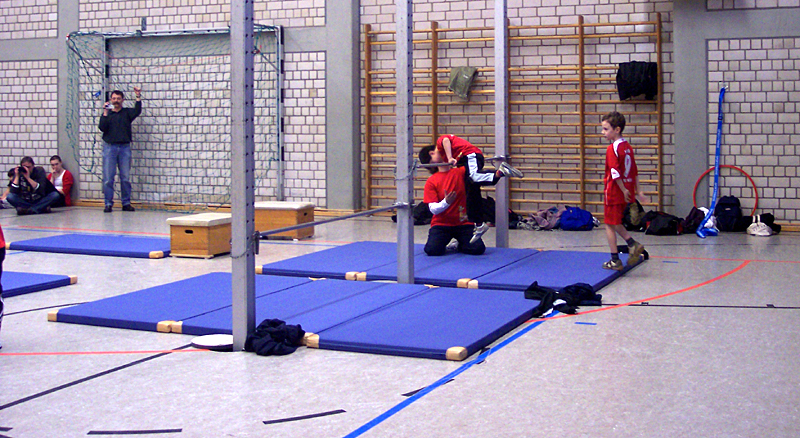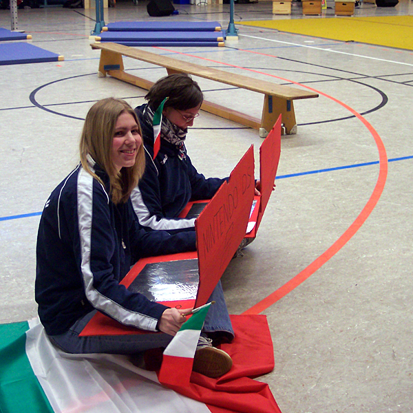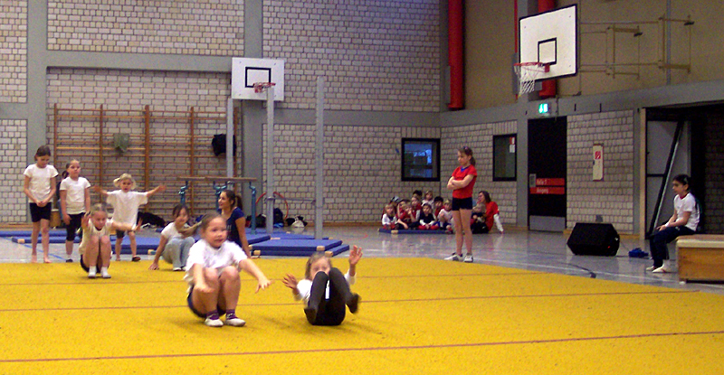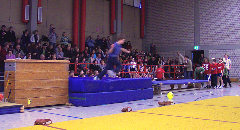 Von Griechenland nach Italien ist es nicht so weit, von daher landeten auch die Schauspielerinnen im zweiten Land der Antike. "In Rom" sprangen einige Jungs auf dem Marktplatz umher - das waren die Sportler der Gruppe J2. Die Übungsleiterin Ute Simmler und ihre Helferin Jennifer Floßbach führten ihre Turner in einer Reihe herein. Die Beiden gingen ganz vorne und trugen selbst gebastelte "Nintendo"-Computer. Damit steuerten sie das Programm, das von Jungs am Trampolin vorgestellt wurde - es wurden verschiedene mehr oder weniger wilde Sprünge gezeigt.