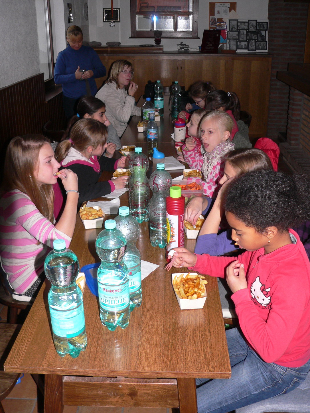 Im Trainingslager 2012 in den Herbstferien waren wir in Stadt Amel. Jeden morgen standen wir um 8:30 Uhr oder um 8:00 Uhr auf, dann mussten immer 1 “Große” und 1 “Kleine” Brötchen holen gehen. Die anderen bereiteten sich zum Training vor. Wenn die zwei Mädchen Brötchen holen gekommen sind, haben wir gefrühstückt. Danach sind wir zum Training gegangen. Nach dem Training gab es dann Mittagessen, worauf sich alle gefreut haben, dass Daniela und Sabine vorbereitet hatten. Meistens hatten wir 2-mal am Tag Training. Mitten in der Woche hatten wir einen Auftrag und zwar mussten wir die Erwachsenen unterhalten. Wir “Großen” haben was gemacht und die “Kleinen” haben was gemacht. Wir “Großen” haben einen Tanz mit Fragen gemacht und die “Kleinen” haben Witze gemacht.