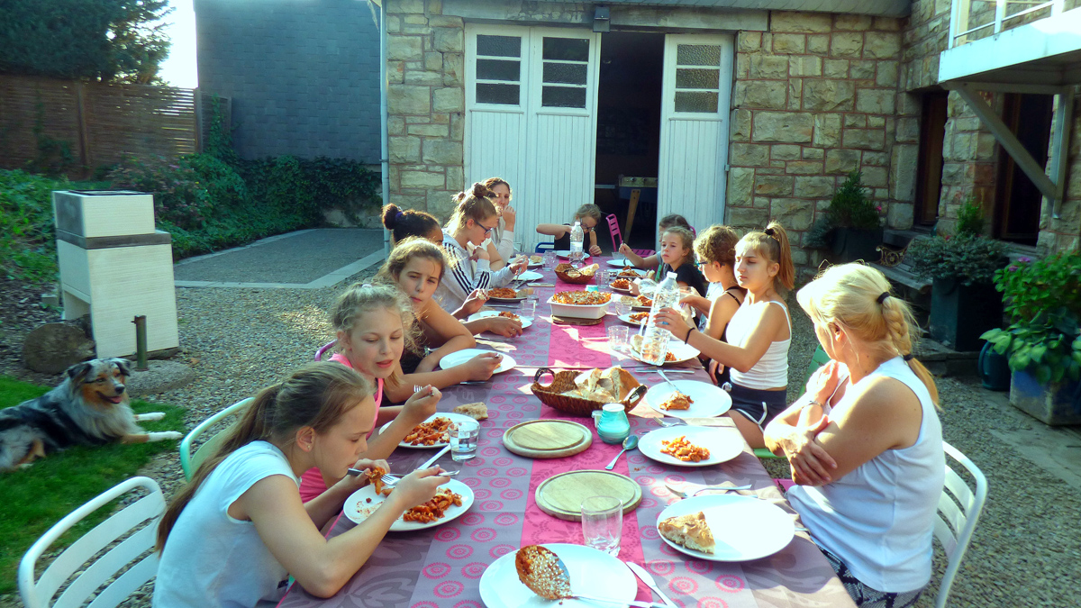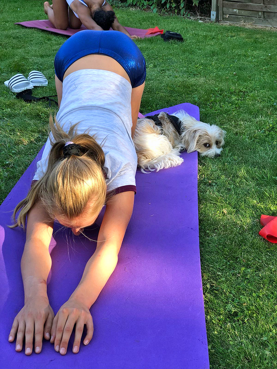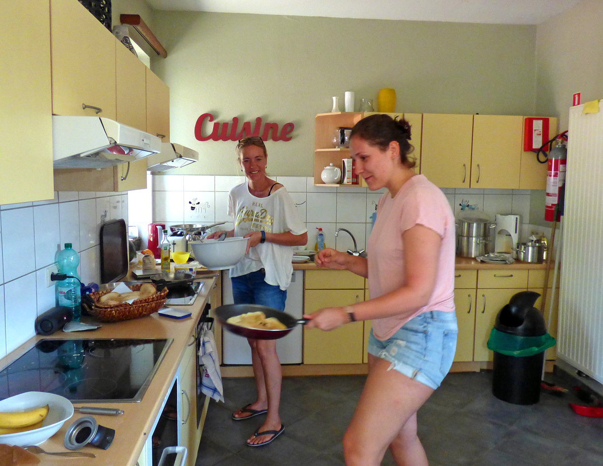 Da wir die Halle besonders für das Training an den Geräten nutzen wollten, machten wir das Kraft- und Dehnungstraining auf der Wiese neben unserer Villa. Das Wetter spielte mit, deswegen war es auch sehr angenehm, sich nach der staubigen und heißen Halle ein bisschen draußen zu bewegen. Und das Abendessen schmeckte uns dann umso besser! Für das leckere Essen möchten wir uns bei Claudia, Michaela und Theresa bedanken!