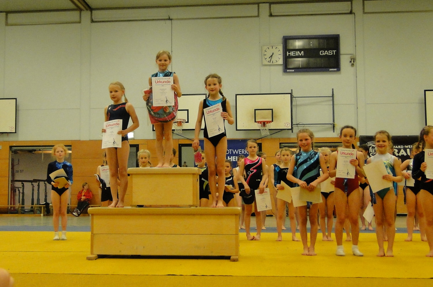 Sie begannen den Wettkampf am Boden, wo sie direkt ihre Stärke präsentieren konnten. Die beste Turnerin war an diesem Gerät Jessica, die für ihre Darbietung 16,50 Punkte von möglichen 17,00 bekam. Am Sprung kämpften die Porzer Mädchen sehr tapfer und setzen die guten Ergebnisse fort. Jessica und Sarah zeigten zur Überraschung aller sehr gute Überschlagsprünge über den Tisch und wurden dafür mit den zweitbesten Sprungnoten (15,65) der Konkurrenz belohnt. Die drittbeste Note bekam Anja für ihren Sprung. Am Stufenbarren gehörten die Turnerinnen aus Porz ebenfalls zur Spitze - Jessica erreichte hier den ersten und Sarah den vierten Platz. Am Ende des Wettkampfs mussten die Mädchen noch ihre Übungen am Zittergerät, dem Balken turnen. Sie waren ziemlich aufgeregt, weil ihnen bewusst war, dass sich hier noch alles entscheiden könnte. Und vielleicht deswegen klappte diesmal nicht alles so gut, wie es klappen sollte. Nur Jessica turnte ihre Übung durch ohne das Gerät unfreiwillig zu verlassen. Entsprechend war auch danach die Gesamtklassifikation. Fenja-Sofie und Anja platzierten sich auf dem Rang 16. und 18. und verpassten damit die Qualifikation. Mehr Glück hatte Sarah, die mit 60,40 Punkten den 6. Platz belegte und sich über die Qualifikation freuen konnte. Vor Freude strahlend stellte sich Jessica auf die höchste Stufe des Podests, da sie in dieser Altersklasse mit 63,35 Punkten gewann. Herzlichen Glückwunsch!