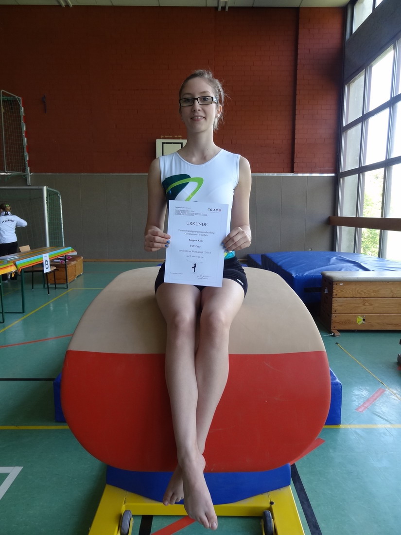 Im ersten Durchgang turnte Kim Kopper (1992) in der altersoffenen Wettkampfklasse. Sie begann ihren Wettkampf am Balken. Obwohl sie einen Sturz in Kauf nehmen musste, bekam Kim in ihrer Riege noch die zweitbeste Wertung. Weiter ging es am Boden. Hier zeigte Kim eine ansprechende Übung und wurde dafür mit 15,65 Punkten belohnt. Als nächstes musste sie ihr Können am Sprung beweisen. Nachdem sie beim ersten Überschlag gestürzt war, zeigte sie im zweiten Versuch einen sauberen Überschlag. Zuletzt musste Kim noch einmal alle Kraft mobilisieren, um am Barren eine gute Übung zeigen zu können. Sie schaffte es ihre Leistungen aus dem Training abzurufen. Gespannt wurde anschließend die Siegerehrung erwartet. Kim belegte den 11. Platz und verpasste somit leider mit 0,2 Punkten Rückstand die Qualifikation für die nächste Ebene.