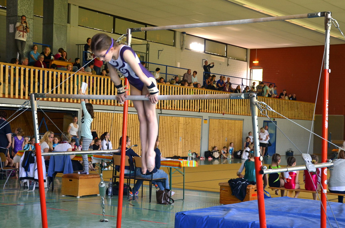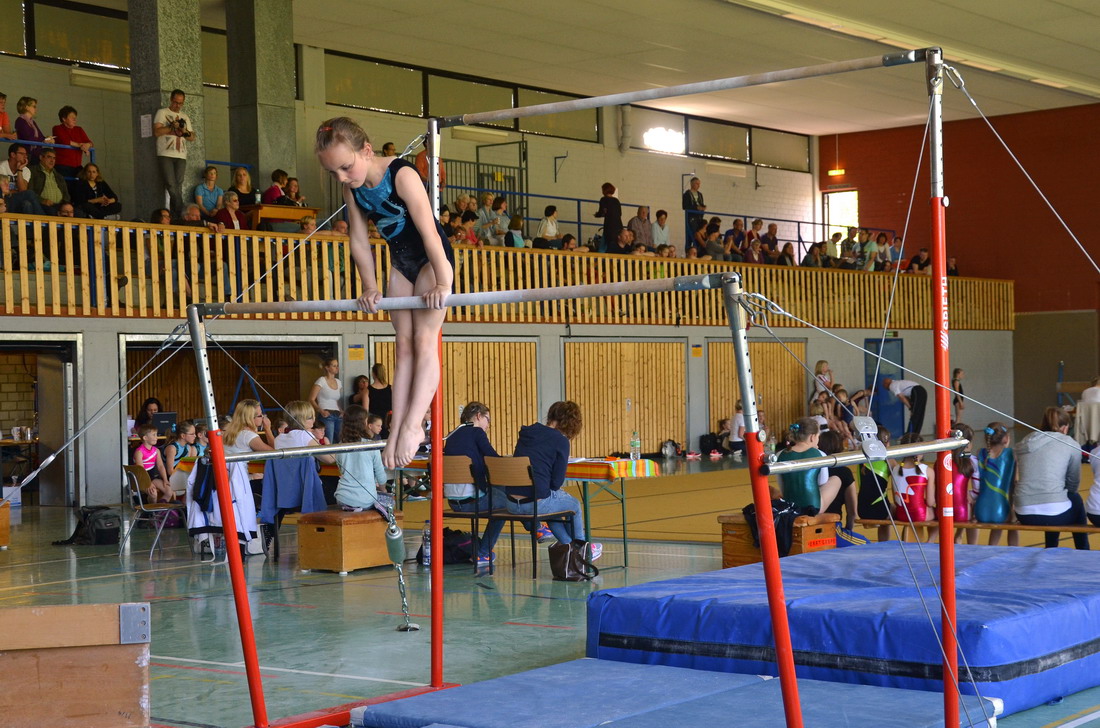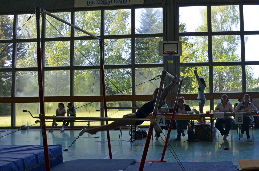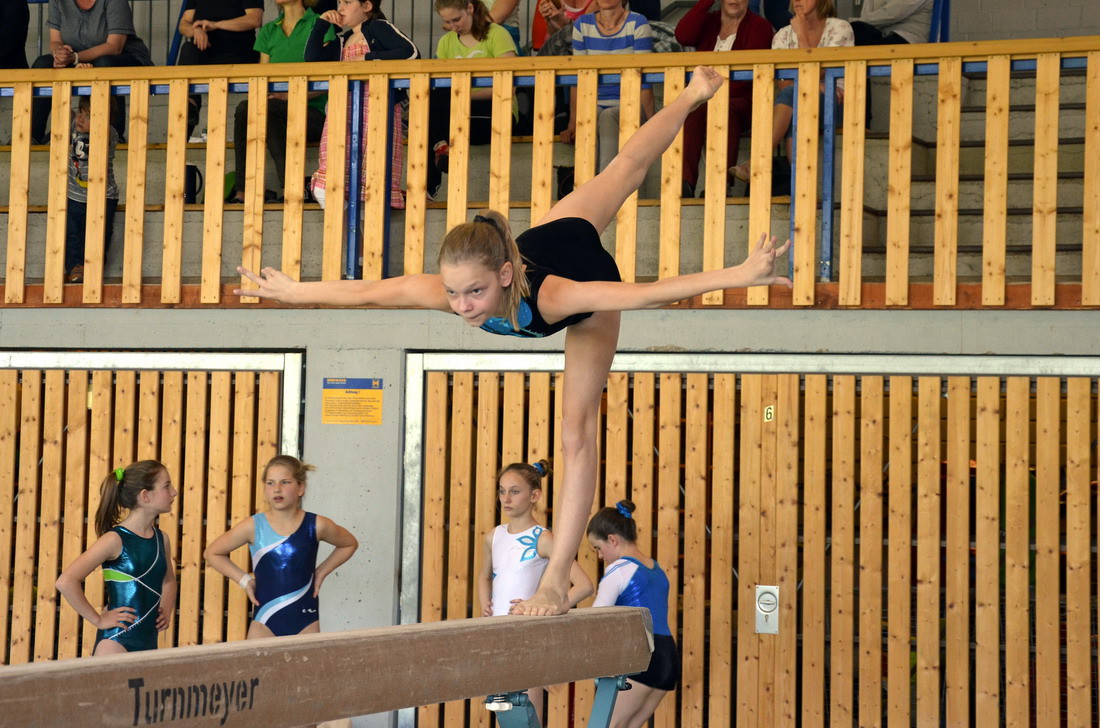 Alle Mädchen begannen ihren Wettkampf am Sprung. Pauline, Anja und Anna zeigten ordentliche Sprünge, während Cecile und Sarah sich sogar über die zwei besten Wertungen für ihre jeweiligen Darbietungen freuen durften. Am Barren konnten alle fünf Mädels überzeugen, indem sie saubere und dynamische Übungen allesamt sturzfrei durchturnten. Hier konnte Pauline die zweithöchste Wertung der Konkurrenz mitnehmen. Am Balken konnten die Porzer Mädels dann ihre Nervenstärke beweisen. Während es bei den jüngeren Turnerinnen einige Konzentrationsprobleme gegeben hatte, konnten die älteren Mädchen auf ihre beachtliche Erfahrung zurückgreifen und zeigten alle sehr sichere Übungen. Cecile, Sarah und Anna bekamen die einzigen 16er Wertungen ihrer Altersklasse und auch Pauline erhielt die Höchstwertung in ihrem Jahrgang. Einzig Anja musste etwas größere Abzüge hinnehmen, da sie die eigentlich harmlose halbe Drehung stark verwackelte. Am Boden zeigte sich dann wieder einmal, dass Schönheit sehr stark im Auge des Betrachters liegt. Obwohl die Mädels alle sehr saubere Übungen zeigten, fielen die Wertungen verhältnismäßig niedrig aus, auch die Relation unter den Porzer Turnerinnen war nur schwer nachvollziehbar. Pauline hingegen konnte sich auch an diesem Gerät die Höchstwertung der Konkurrenz sichern.