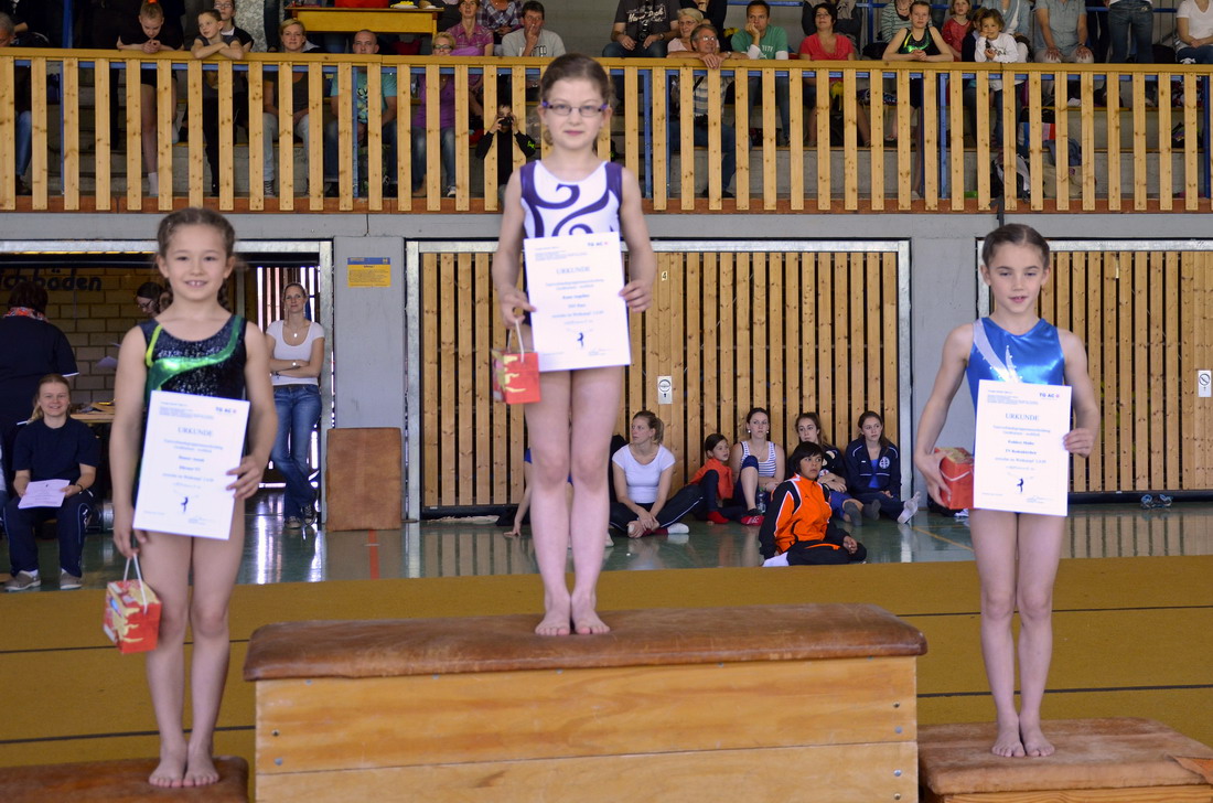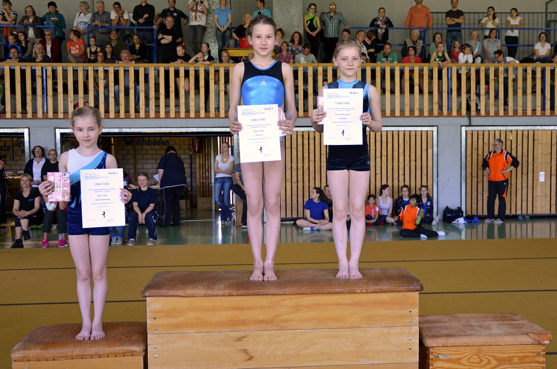 Nichtsdestotrotz gestaltete sich die Siegerehrung sehr erfreulich, alle fünf Turnerinnen erreichten die Qualifikation für das Landesfinale. Anja klassifizierte sich auf dem 9. Platz, Anna belegte Platz 4. Cecile und Sarah tauschten im Vergleich zu den Regionalmeisterschaften die Plätze, Cecile belegte diesmal den 2. Rang während Sarah sich auf das oberste Podest stellen durfte. Auch Pauline gewann mit knappem Vorsprung ihre Altersklasse und belegte den 1. Platz.