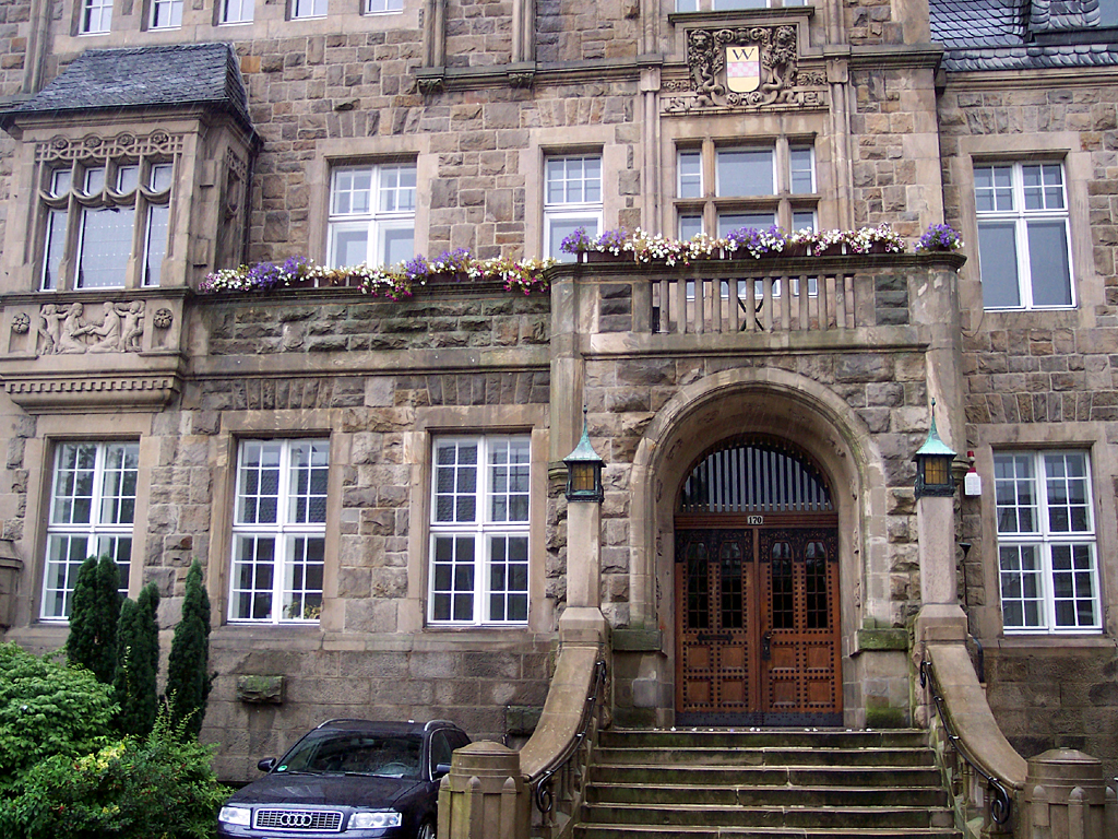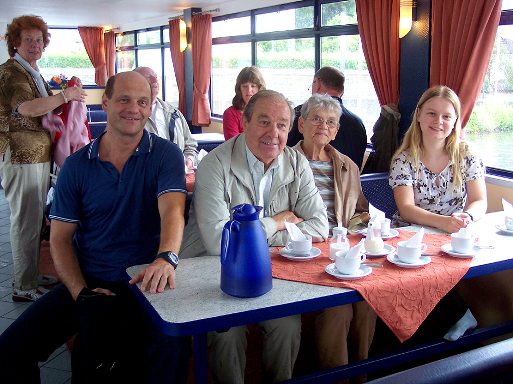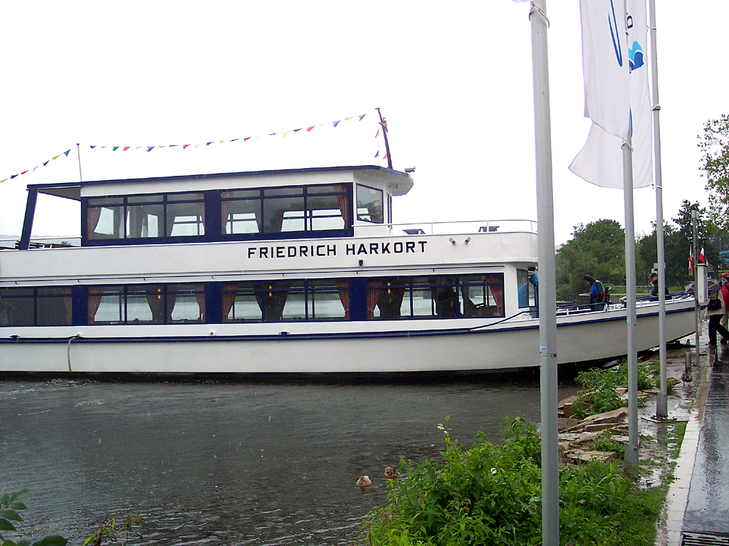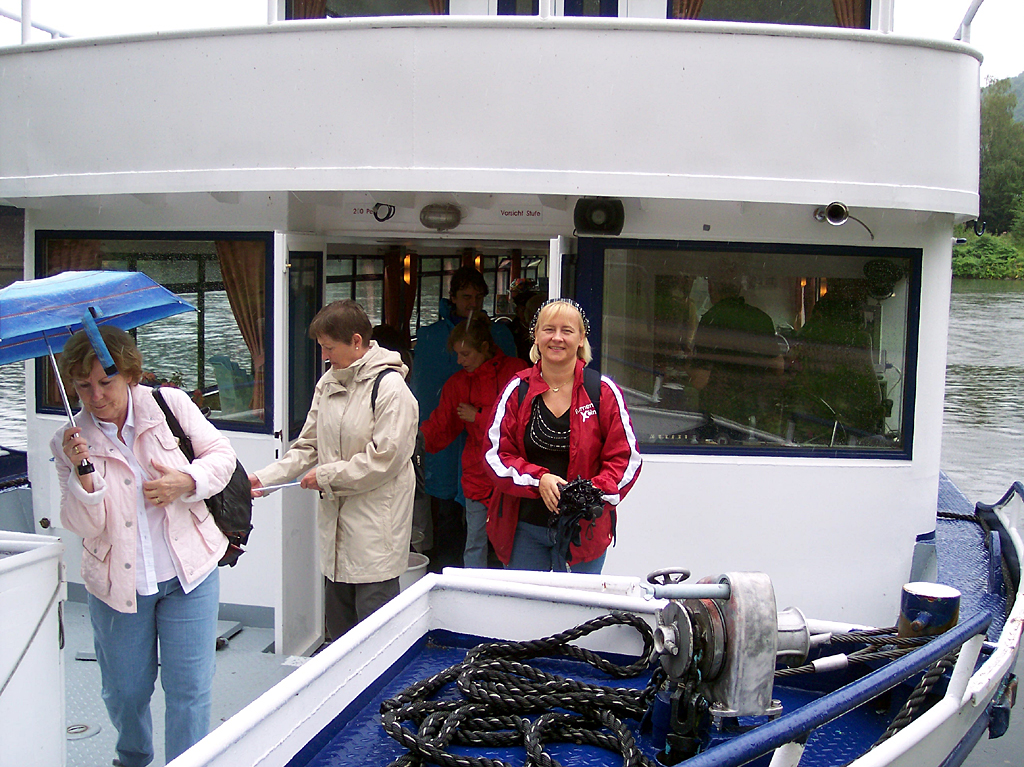 Nach gutem Essen und kühlen Getränken, welches uns reibungslos sofort serviert wurde, ging die Besichtigungstour durch den historischen Stadtkern von Wetter weiter. Zum besseren Uberblick über die Region wurde von einigen von uns alte Burgruinen erklommen werden. Auch alte Einrichtungen von berühmten Einwohnern Wetters, wie Henriette Davidis, die Mallinckrodts und Freiherr von Stein wurden uns gezeigt. Unser Wanderweg führte uns dann weiter an Hakort-See. Hier lag für uns das Fahrgastschiff "MS Schwalbe" an der Brücke, um uns nach Hattingen zu fahren. Bei Kaffee, Waffeln mit Sahne und Kirschen waren wir in einer Stunde dort.