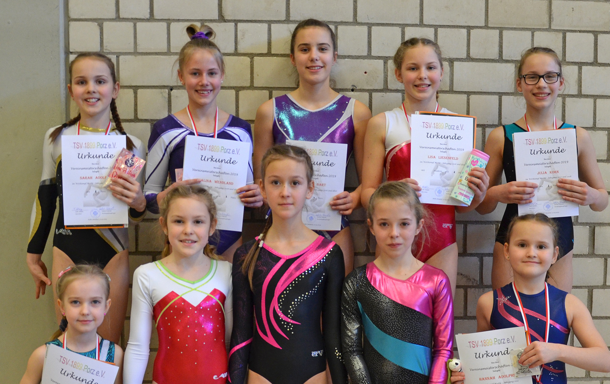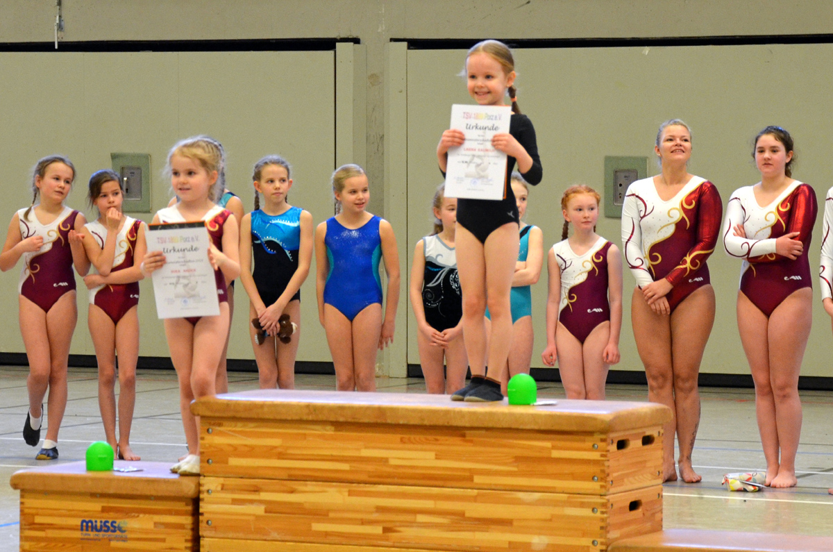 So konnten sich bei den Wettkämpfen der Mädchenturngruppen im Pflichtvierkampf Hannah Schumacher (JG 2008 u. älter), Diana Skyryanski (JG 2008/2009), Emilia Arzich (JG 2011/2012), Larina Kalimulin (JG2013 u. jünger) und im Kürwettkampf Nika Tjart (LK4) und Dalia Grozdanic (LK3) gegen ihre Trainingskameradinnen durchsetzen.