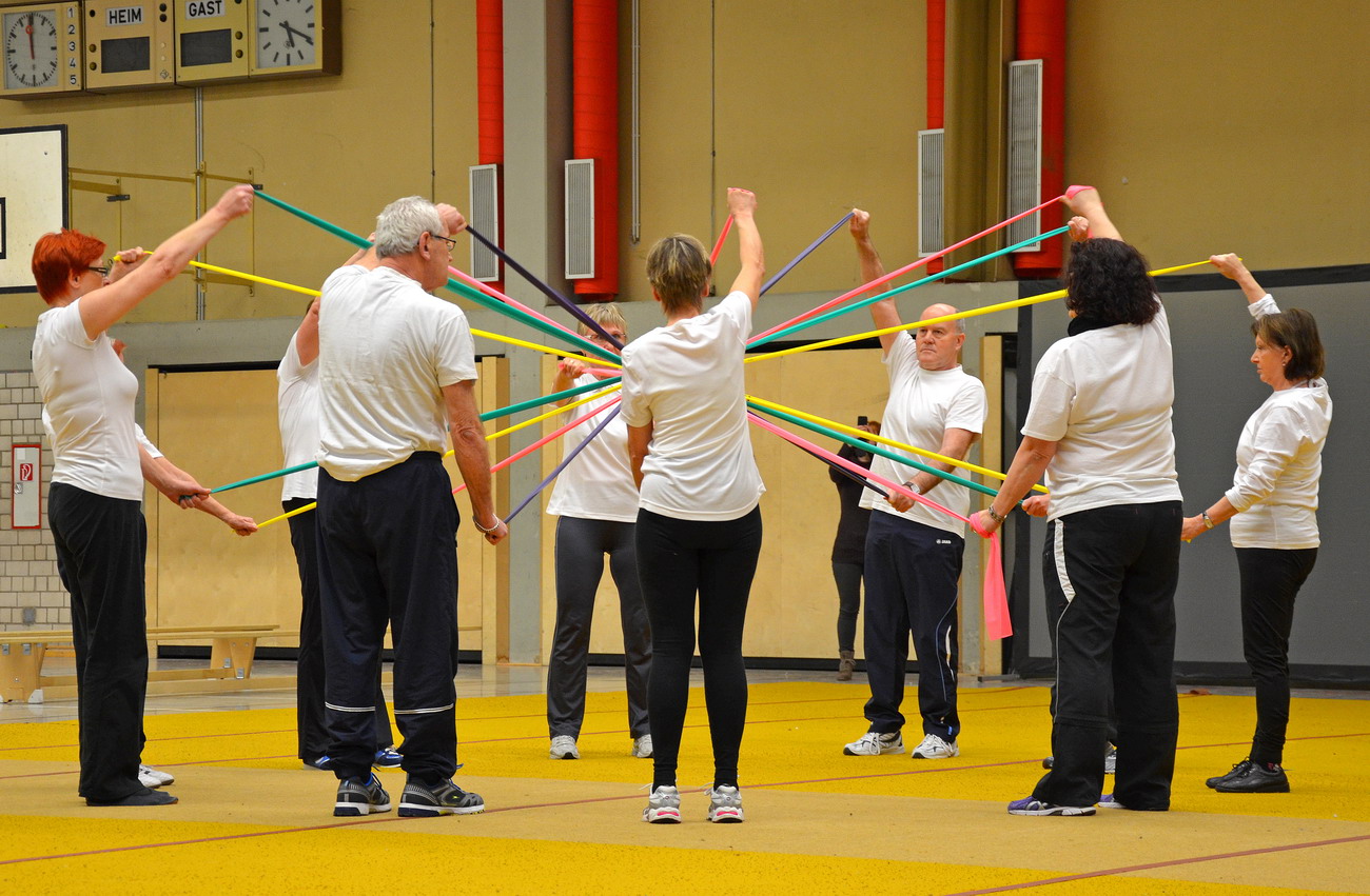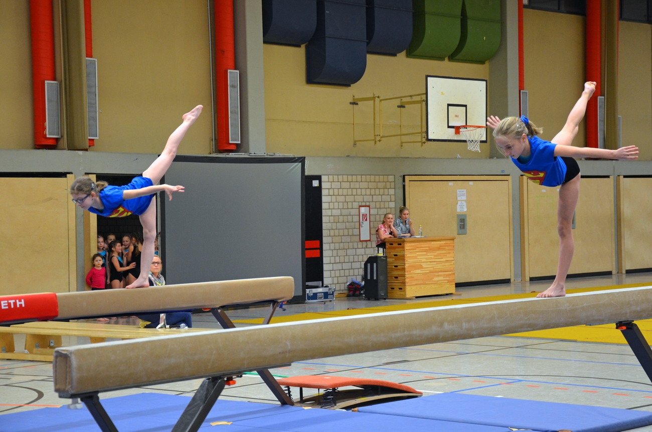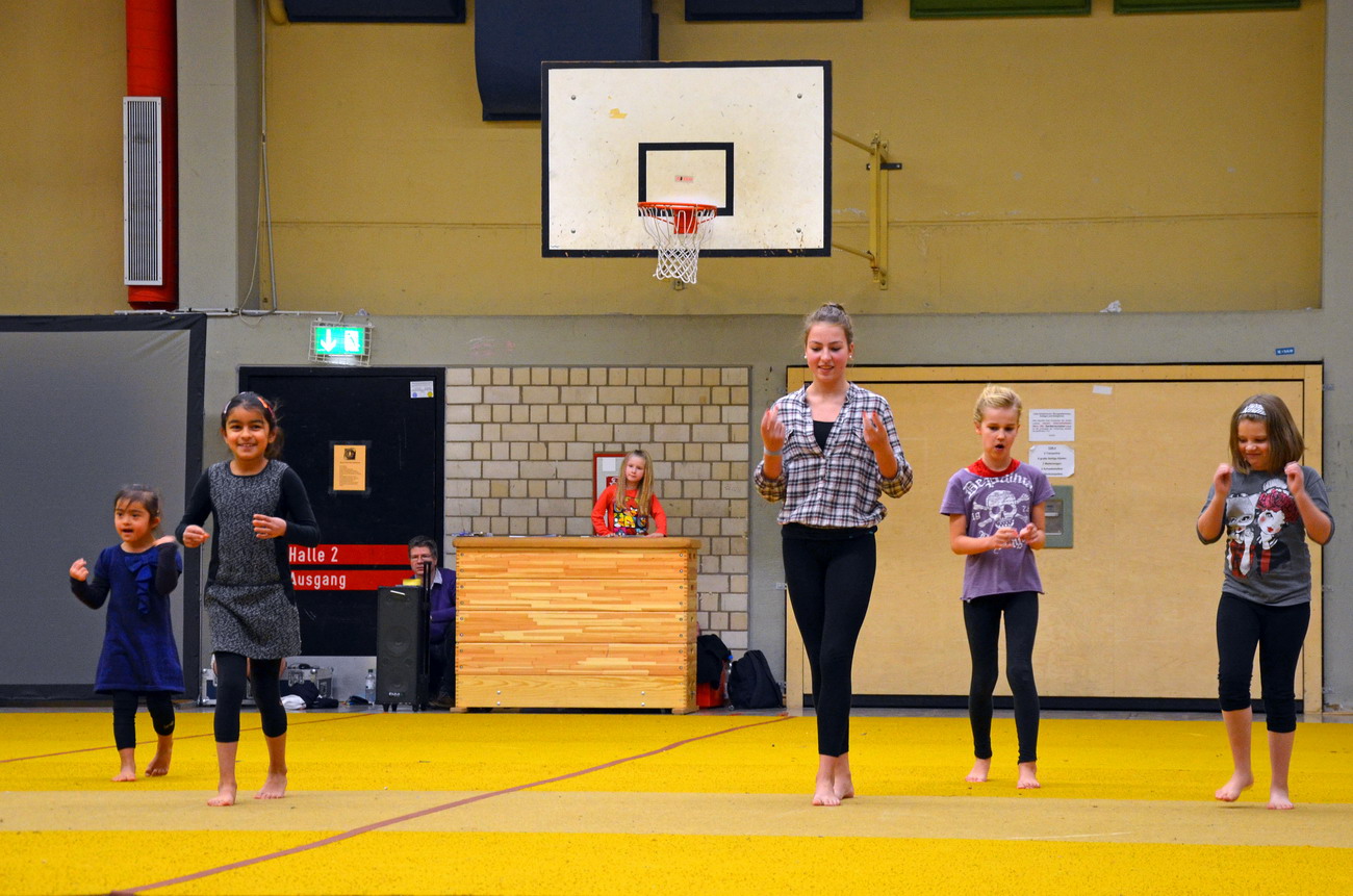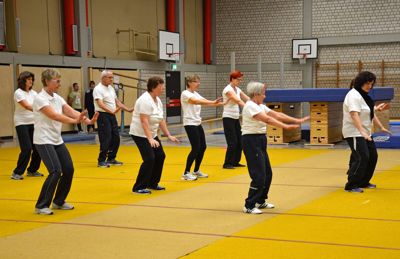 Die aktiven Sportlerinnen und Sportler von ganz klein (2 Jahre) bis ganz groß (78 Jahre) zeigten ein tolles und unterhaltsames Programm ihres Könnens. Das Überwinden eines Hindernisparcours gehörte genauso dazu, wie anspruchsvolle Übungen am Boden und am Schwebebalken, über Koordinationsspiele mit Bällen bis hin zur Tanzdarbietung nach Zumba-Art und Qi Gong. Die Stimmung war großartig, das Publikum mit über 200 Zuschauern klatschte im Takt der Lieder fleißig mit und spendete den Akteuren großen Beifall.